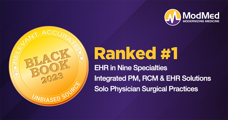 ModMed also ranked #1 for integrated physician practice management, revenue cycle management, and electronic health records solutions for a fifth consecutive year and #1 for solo physician surgical practices EHR (all surgical specialties) for a fourth year in a row.