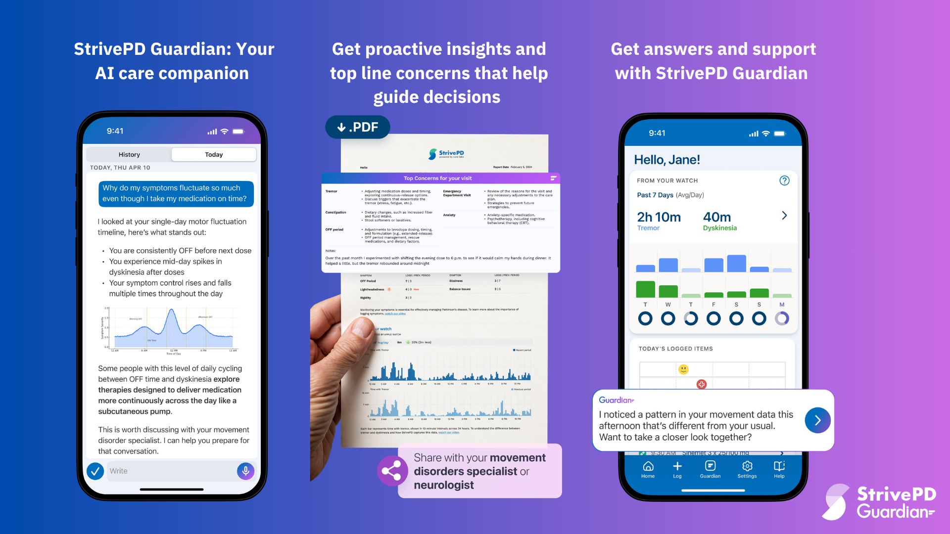 “It’s like having a conversation with my own StrivePD data. The monthly AI reports help me step back and see the bigger picture, and the StrivePD Guardian chat helps me day to day. I can ask questions, get quick answers, all grounded in what I’ve logged,” said Kevin K., a StrivePD Guardian user. “I’ve asked it to review my many unique symptoms and their fluctuations and trends, and prepare me for what to discuss with my clinician.”